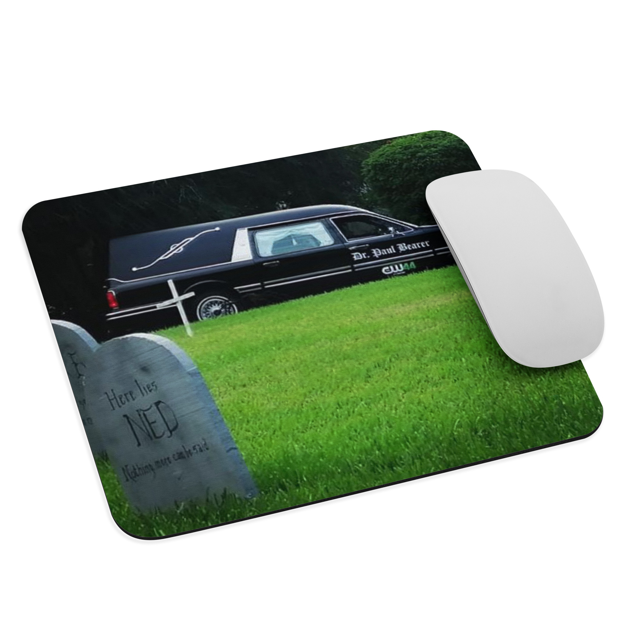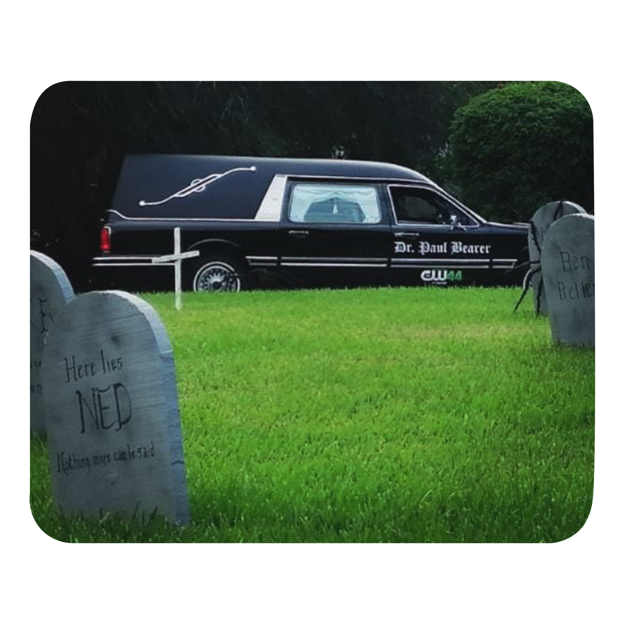 Dr. Paul Bearer’s mouse pad features the majestic Hearsetine—his beloved hearse and the only vehicle that gets 6 feet per gallon. With its glossy black finish and coffin-grade suspension, Hearsetine cruises across your desk like it’s headed to a midnight funeral rave. Whether you’re clicking through graveyard memes or embalming spreadsheets, this pad keeps your mouse gliding smoother than a ghost on roller skates. Warning: prolonged use may result in spontaneous organ music and an uncontrollable urge to pun about death.